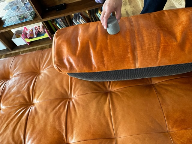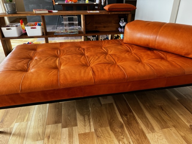 画像は背もたれクッションのみオイルを塗布した状態です。オイルを塗った後はワントーン色が濃くなりますが、次第に元の色に戻っていくようです。