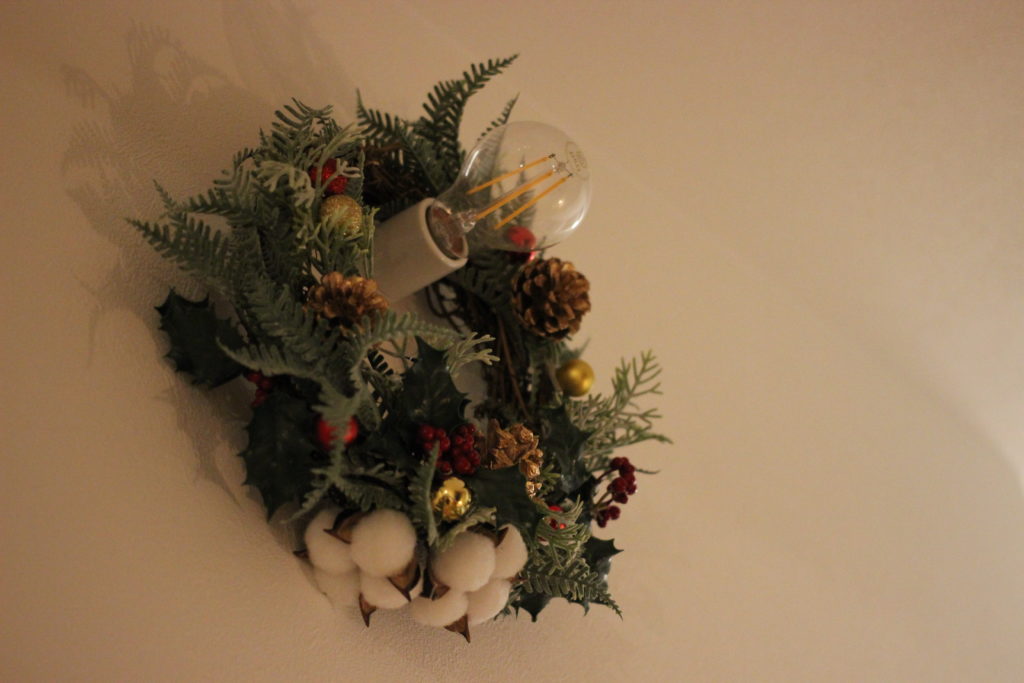 玄関ドアに飾る予定でしたが、何故か壁の電球にひっかけていた夫