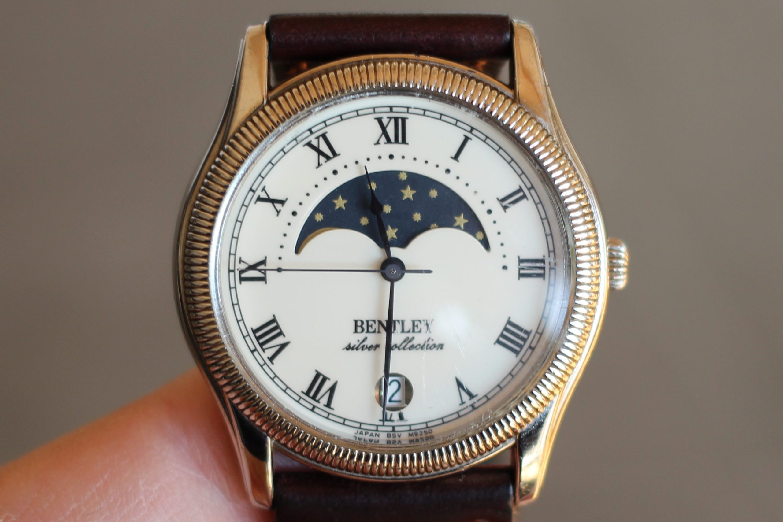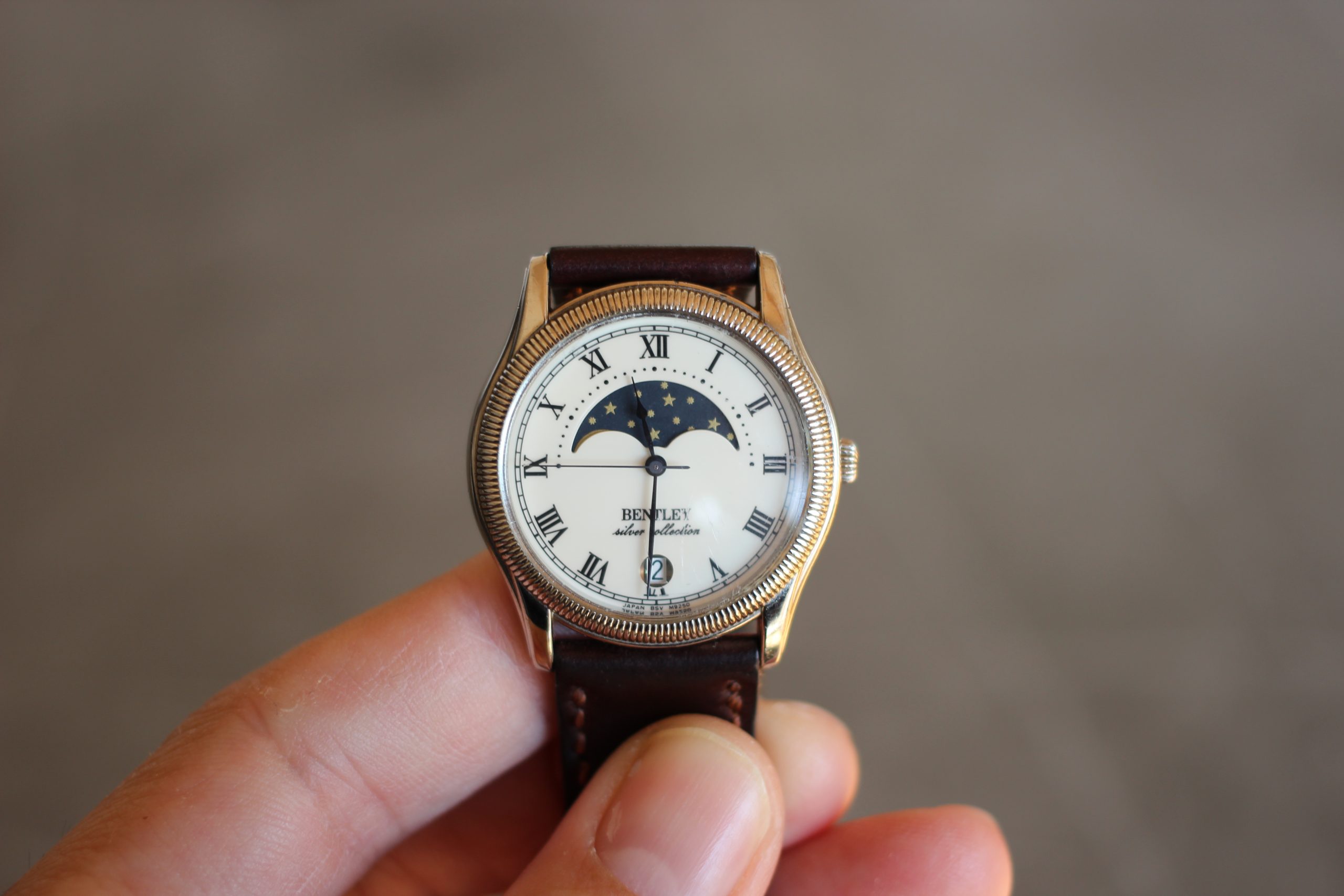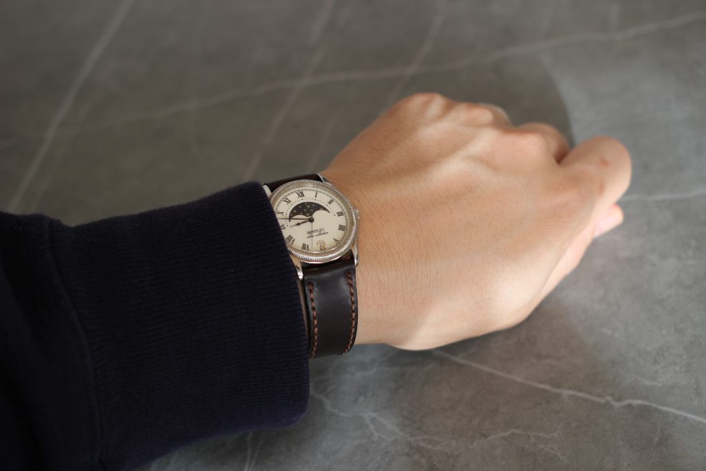 インデックスはローマ数字で、ムーンフェイズが採用されたクラシックな外観です。